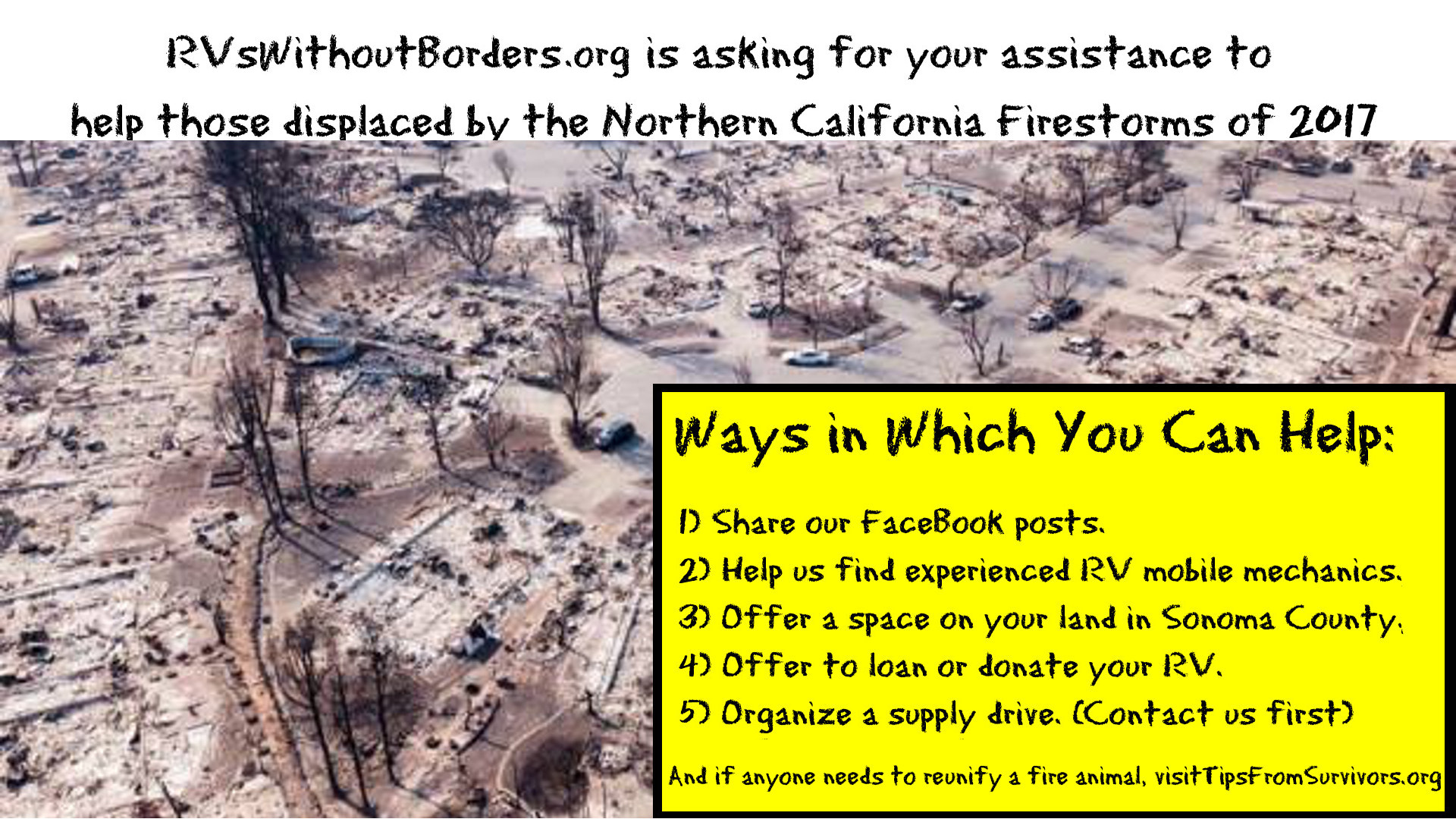 By connecting RV owners directly with individuals in need who then find locations for their transitional shelter within their community, we hope to enable more disaster victims to transition among friends and family in familiar surroundings, instead of in institutional camps or geographically dispersed. We envision RV use beginning in a friend’s driveway, and transitioning to the RV user’s burned property after toxics are cleared to support reconstruction.